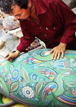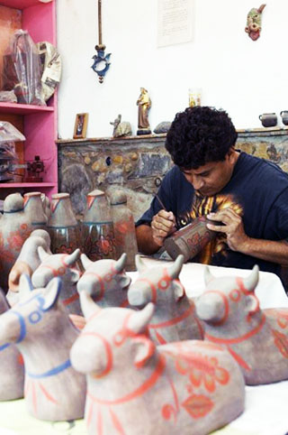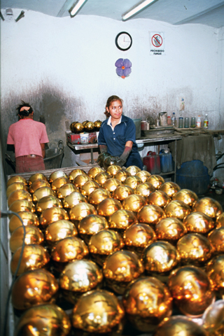 Esferas doradas de cristal obtienen sus toques finales en una fábrica de vidrio locales y los trazos finales de engobe la pintura utilizada en la cerámica tradicional se pone en una pieza que está destinada a la venta en Casa de las Flores maravillosa pequeña galería de arte popular.