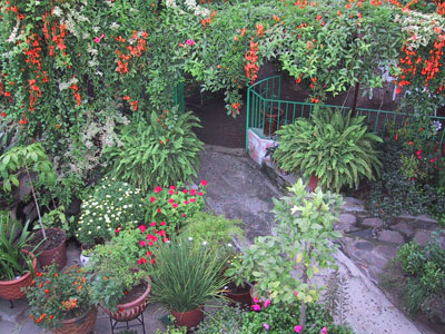 El jardín es, literalmente, la característica central de Casa de las Flores, un oasis de verdor y flores de colores se extiende entre altas paredes de adobe cubiertas de viñedos desde el patio de la casa principal del ala de huéspedes de dos pisos en la parte posterior de la propiedad. Curvar los caminos llevan a huéspedes de las plantas florecientes en macetas en el patio, a través de las camas de siembra.