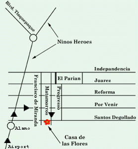 Si usted está tomando un taxi desde el aeropuerto a Casa de las Flores, por favor llamar la atención de su controlador a este mapa.