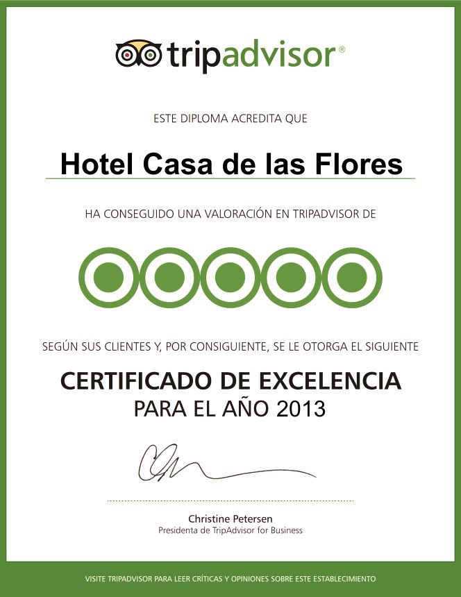 Hotel Casa de las Flores se le concedió el premio más alto por Trip Advisor para el año 2014 los Mejores Bed and Breakfast en México.